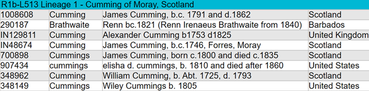 past, but it has two main limitations: 1) There always comes a point when written records cannot be found. Perhaps they never existed, or it may be that they have been lost. 2) If there was an occasion when a child was born to an unknown father, the biological descent cannot be followed. It may even mean that the traditional paper-based research is wrong, and it may also be impossible to tell whether this is the case. However, in recent years developments in DNA testing mean that these issues in traditional genealogy can, perhaps, be overcome. There are three main types of DNA test (each of which consist of a simple saliva swab, and the need to sign a consent form): 1) Automsomal DNA (atDNA) considers every line of ancestry going back 6-8 generations. [Ancestry] 2) Y-DNA considers the paternal line from son to father to grandfather, all the way back. [Family Tree DNA] 3) Mitochondrial DNA (mtDNA) considers the maternal line from child to mother to grandmother, all the way back. [Family Tree DNA] In each case, it's best to use the company (shown in square brackets) which has the largest database so that one has the best chance of matches being found. Given that this page is about the male Cumming line going back around one millennium, the Y-DNA test is the only one which is useful for our purposes. FTDNA offer two types of Y-DNA test which compare markers on the Y-chromosome; markers are points on the Y-chromosome which change slowly as they are passed from father to son, and on down the generations. The technical explanations are quite complex, so for now it is perhaps enough to distinguish between them as follows: 1) The simplest initial tests read just 37 (Y37) and 111 (Y111) selected markers. They are good for showing that two men may be related, and excellent at proving that two men are definitely not related. 2) There is a more advanced test called the Big Y-700 which reads many more markers along the Y-chromosome, and also analyses those markers in a more detailed way. This test helps us to prove whether two men are related in any meaningful way, and also to estimate when the most recent common ancestor of two related men may have lived. The Big Y-700 test is by far the most useful, although it is the most expensive. Remember that a Y-DNA test can only be done by males, as only males carry a Y-chromosome. However, many female family historians get involved with Y-DNA testing by asking their male relatives to test. The Cumming Y-DNA Surname Project FTDNA also provide the web-based infrastructure for the Cumming Surname Project. This enables the volunteer project co-ordinators (John Cleary and Timothy Cummings) to collate testers into genetic groups. The group considered below is known by the name Cumming of Moray, Scotland - each particpant has a Kit Number which helps to anonymise the results, meaning that each individual can remain as private (or not) as they wish. The only exception to this is that each member is asked to provide an email address by which any matches can make contact. This is part of what FTDNA currently have for the group being considered here: |