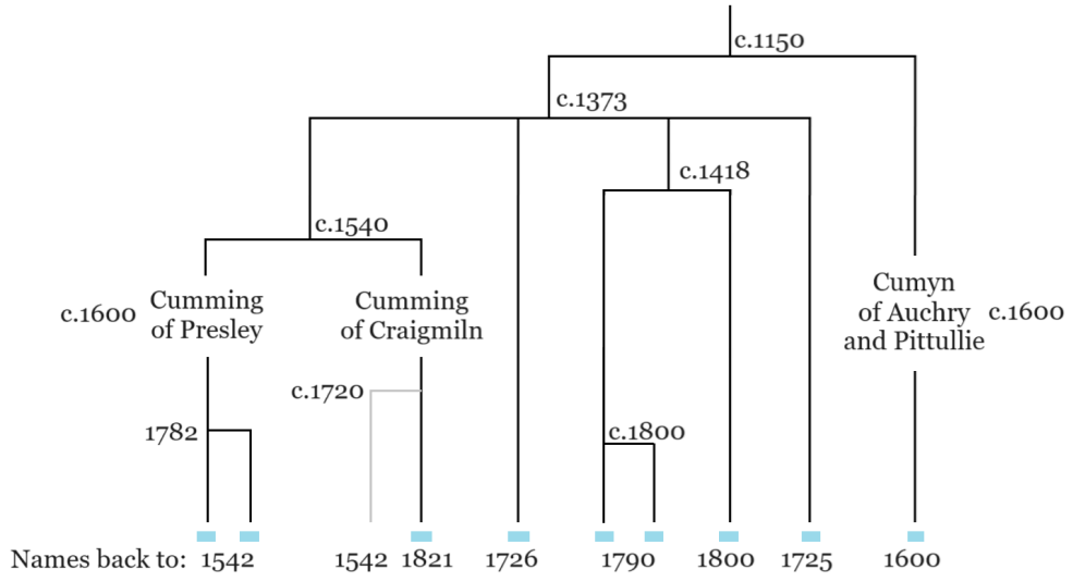 Conclusions With one exception, all the males who took part in testing have the surname Cumming (or a variant of it). The exception can almost certainly be explained by the horrors of slavery, which some Cummings of Moray played a significant part in. The fact that this group have the same surname and that we have a common ancestor c.1150 surely could not have come about unless that ancestor was known by the name of Cumming. In addition, it seems likely that he was a man of north-east Scotland, given that each of Presley, Craigmiln, Auchry and Pittulie are between Inverness and Aberdeen. Further analysis by John Cleary indicates that he was probably of ancient Scottish descent, rather than Norman. It may be that he was one of the thirty-two belted knights referred to above, and that he took the name because of his allegiance to the Comyn lordship. |